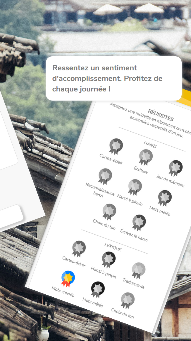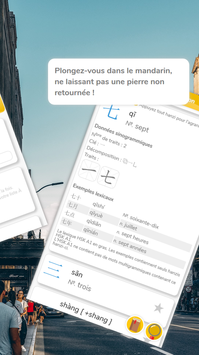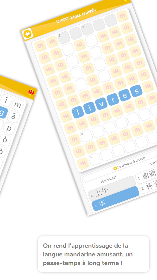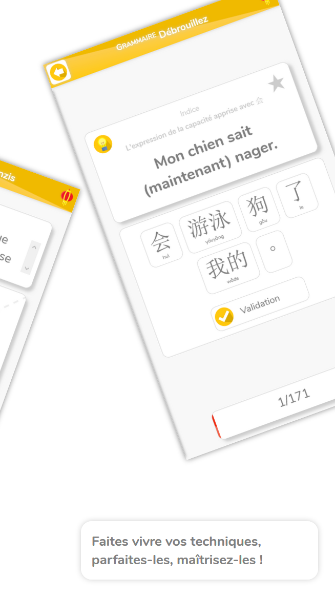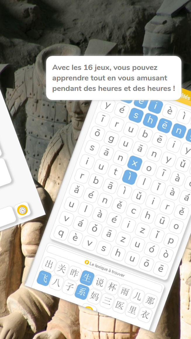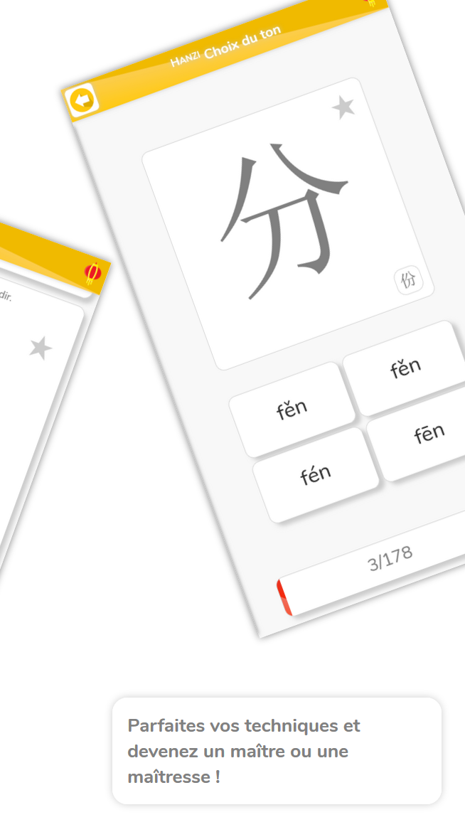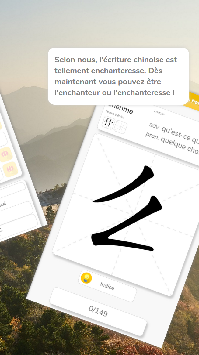Que vous soyez sinophile (amateur ou amatrice des choses chinoises), intéressé-e pour faire des affaires dans la première puissance mondiale ou pour apprendre le mandarin pour les affaires dans votre pays d'origine, jetez un œil à Apprenti HSK. Avec les 16 jeux couvrant l'écriture, la traduction, la prononciation et l'emploi de la grammaire, vous pourrez cartonner à l'examen tout en vous amusant. Développé par des linguistes et locuteurs du mandarin, nous garantissons l'expérience le plus efficace en termes de temps de l'apprentissage de la langue mandarine.